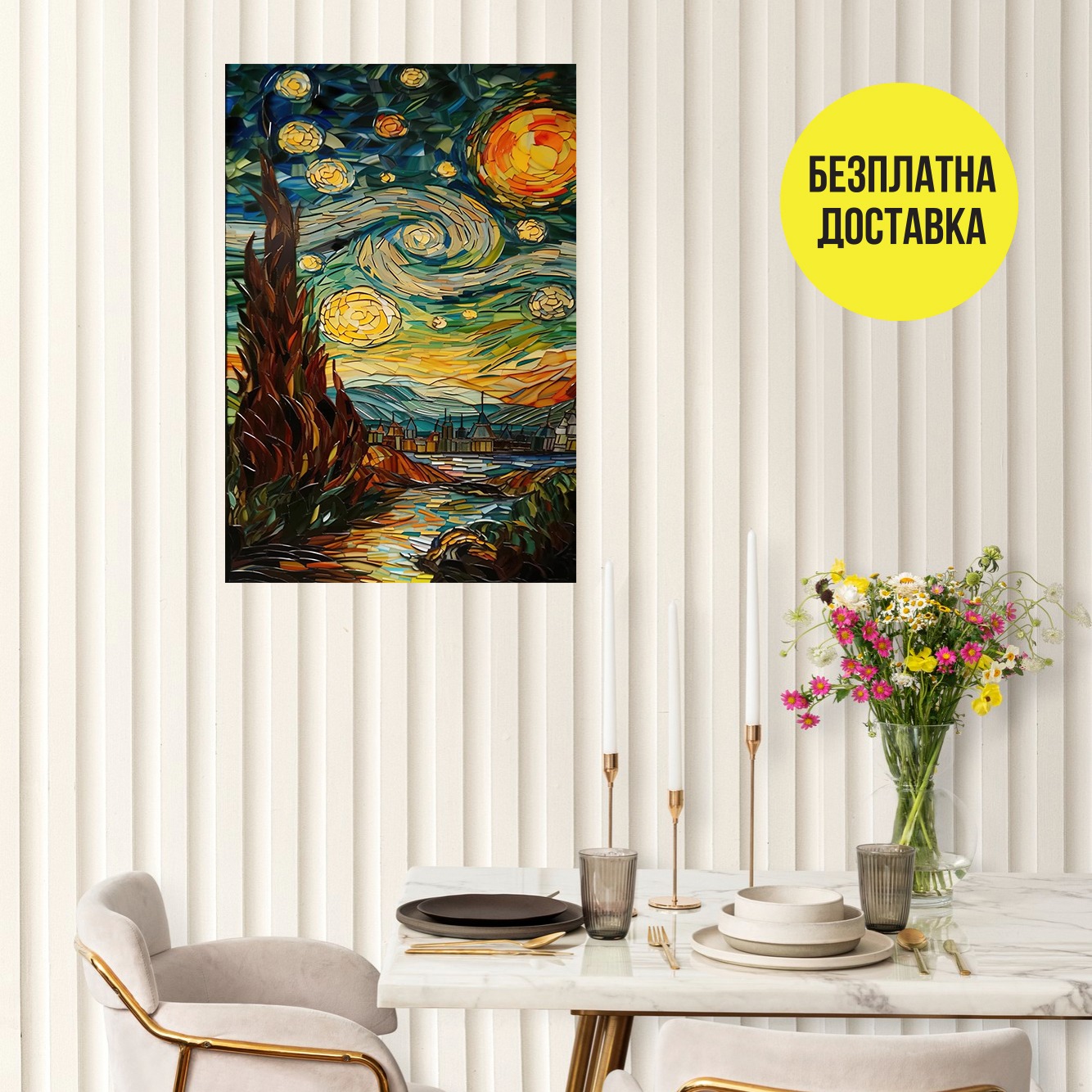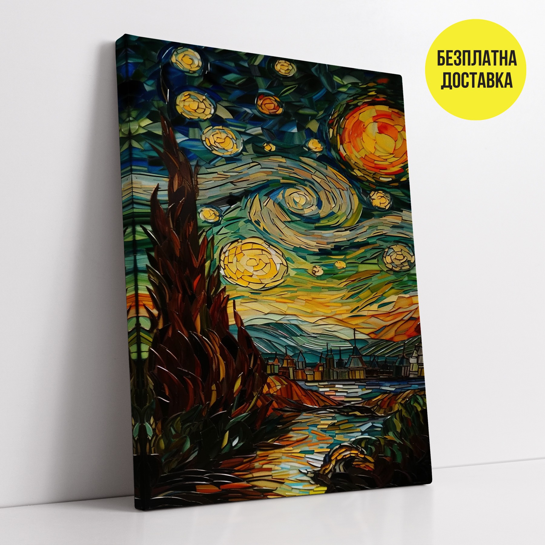 Висококачествен дигитален печат на 100% памучна канава изпъната прецизно на дървена подрамка от иглолистна дървесина с дебелина 2см. Допълнително защитена с прозрачно лаково покритие, предпазващо я от вода и отпечатъци при докосване. Всички картини се предлагат готови за окачване.