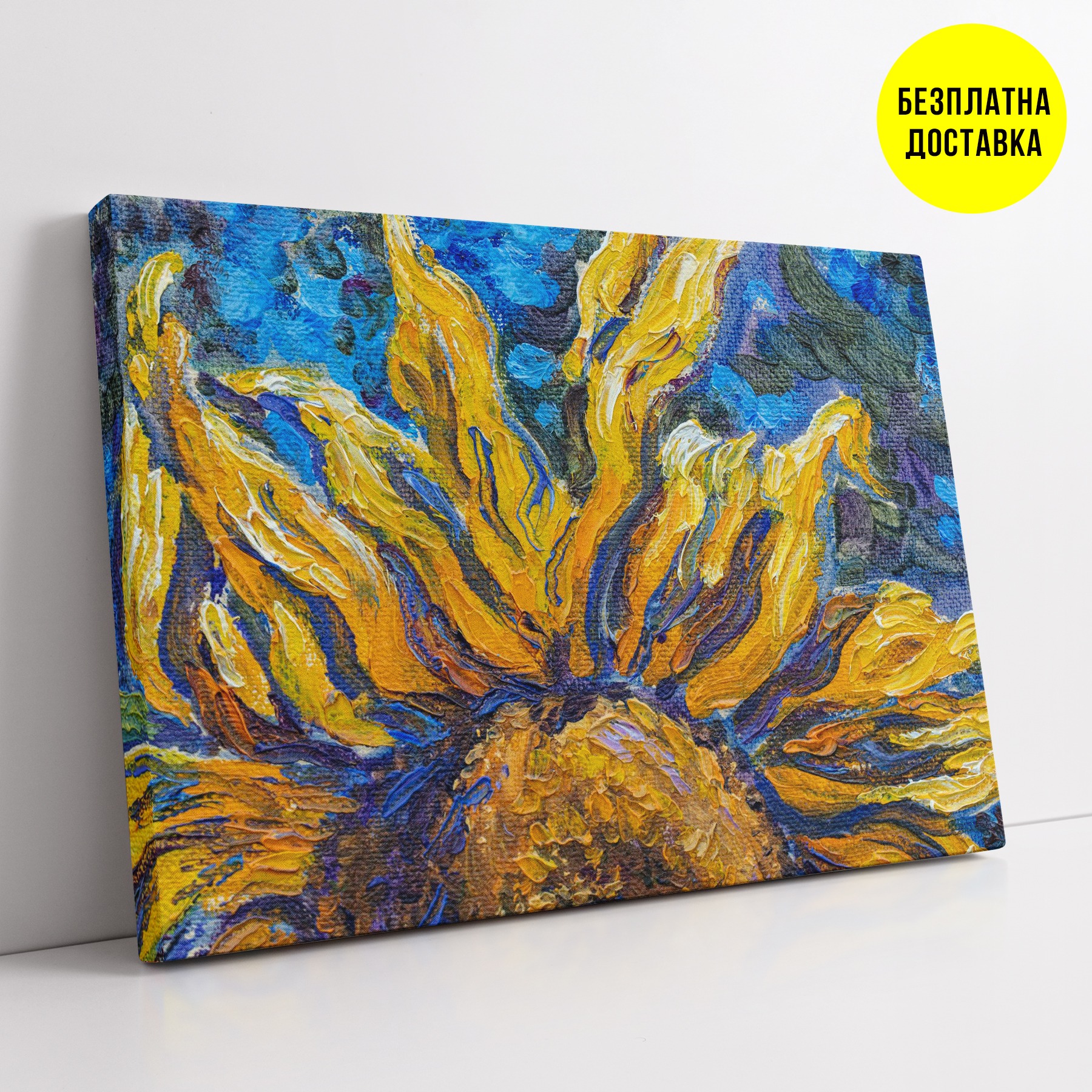 Висококачествен дигитален печат на 100% памучна канава изпъната прецизно на дървена подрамка от иглолистна дървесина с дебелина 2см. Допълнително защитена с прозрачно лаково покритие, предпазващо я от вода и отпечатъци при докосване. Всички картини се предлагат готови за окачване.