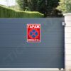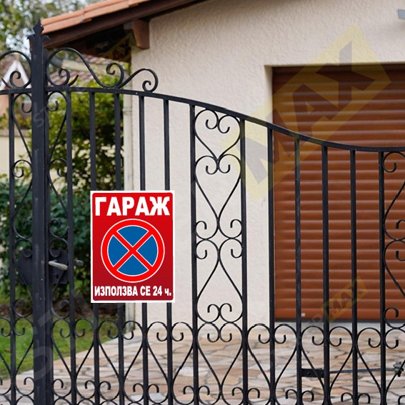 Табела или стикер „Гараж – Използва се 24 ч.“ в червен цвят, с ясно обозначение за постоянно активен гараж. Подходяща за гаражи, паркинги и частни имоти, за да се предотврати неправомерно паркиране.