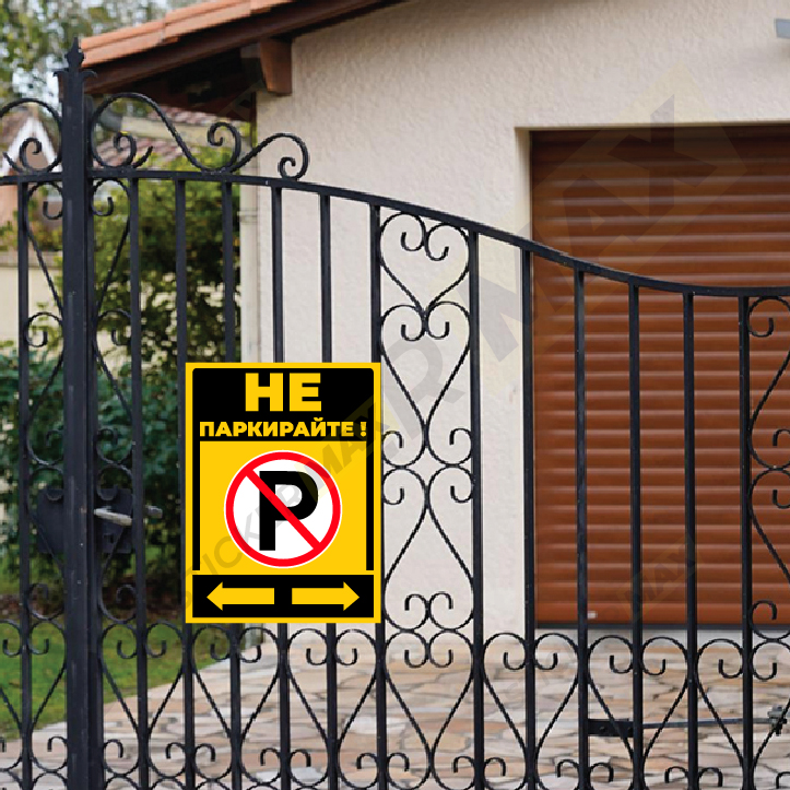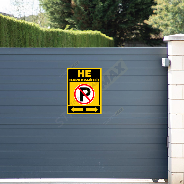 Табела или стикер „Не паркирайте – P“ в жълт и черен цвят, подходящи за гаражи, входове и паркоместа.