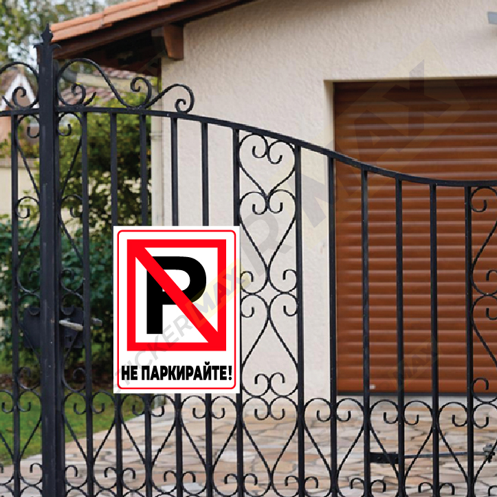 Табела / стикер със знак „P“ за забрана на паркиране в черно и червено, с ясно видим символ за обозначаване на зони със забранено паркиране.