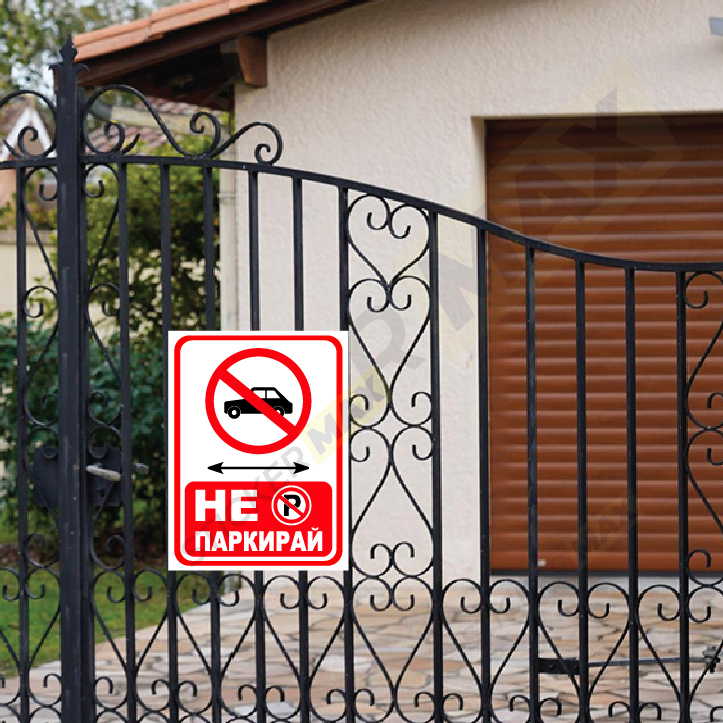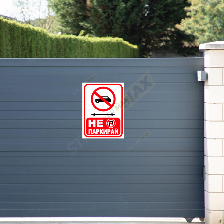 Табела или стикер „Не паркирай“ в бял и червен цвят, с ясен и контрастен надпис за обозначаване на зони със забрана за паркиране.